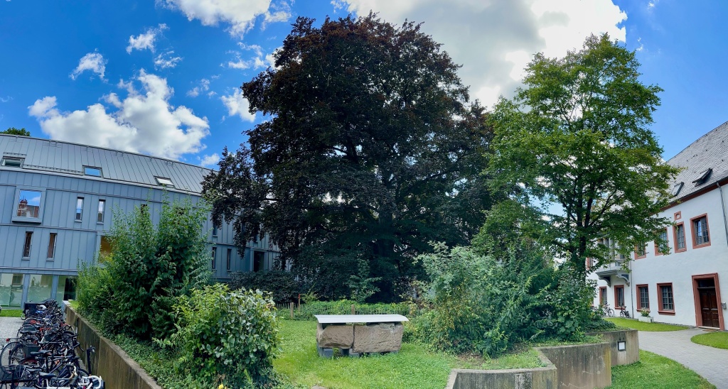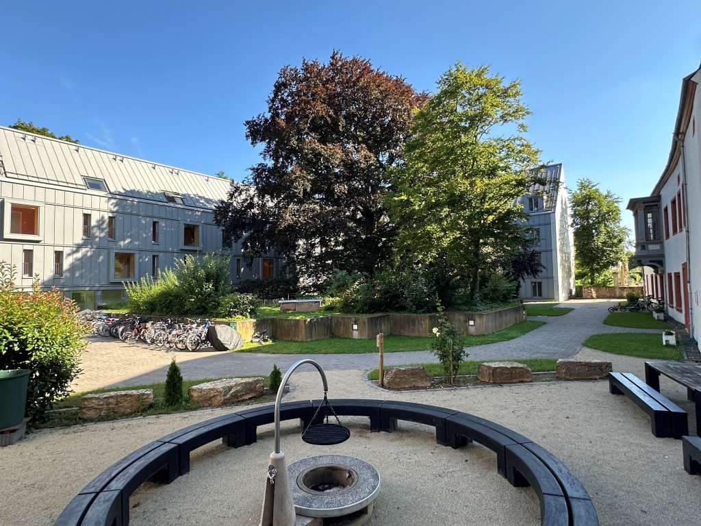 Der Innenhof der Wohnanlage mit seiner imposanten Blutbuche und der gemütlichen Grill-Ecke bietet den BewohnerInnen eine Oase der Ruhe und Erholung inmitten des städtischen Hektik.