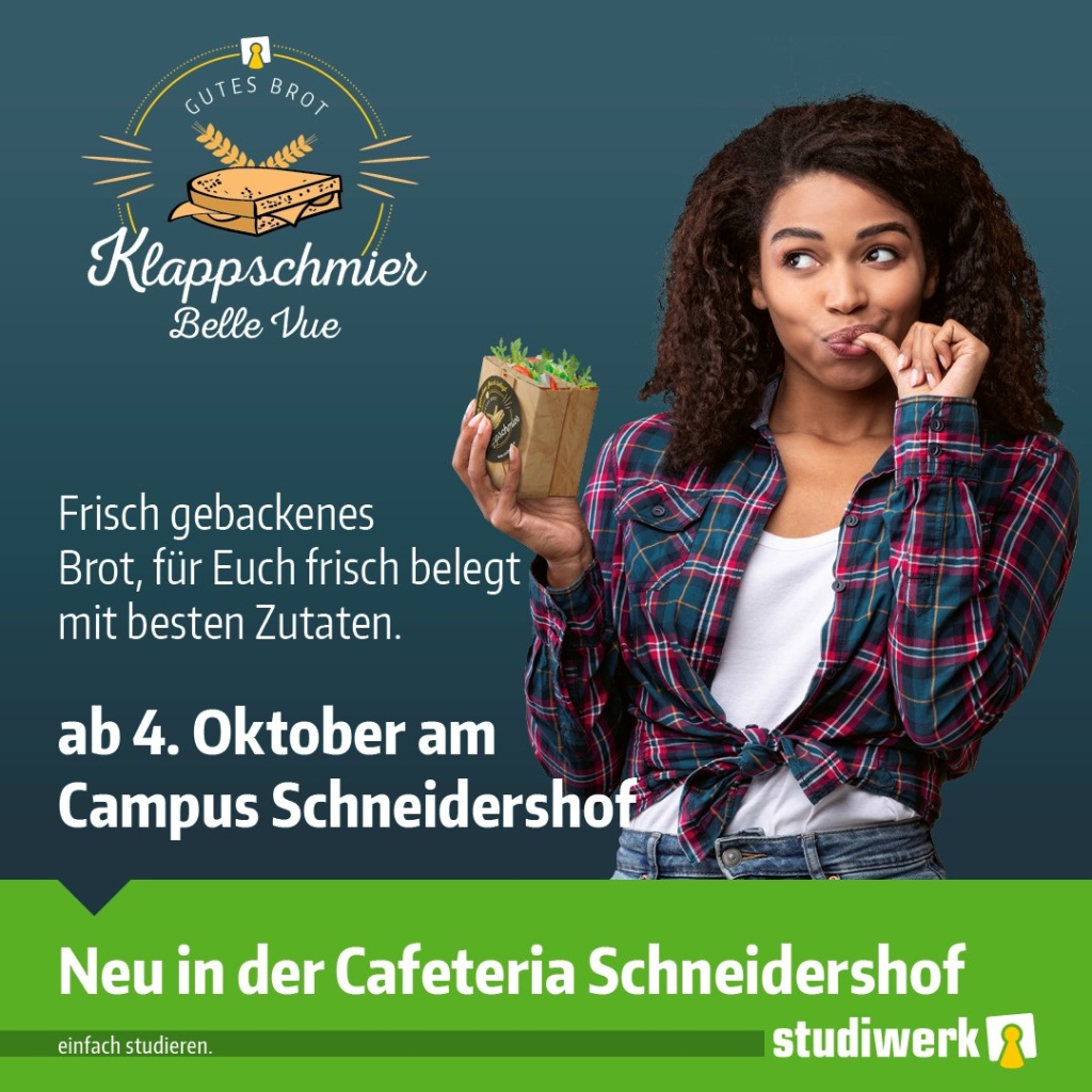 PREMIERE am Campus Schneidershof: "Klappschmier - Belle Vue"! Ab dem 4. Oktober gibt es auch in unserer Cafeteria Schneidershof zum Start ins neue Semester frisch gebackenes Brot mit besten Zutaten frisch belegt. Aus diesem Grund wird die Cafeteria vorübergehend vom 28. 09. bis 02.10 aufgrund der Umbaumaßnahmen geschlossen.