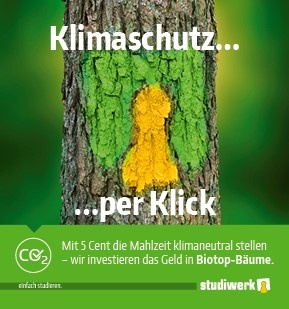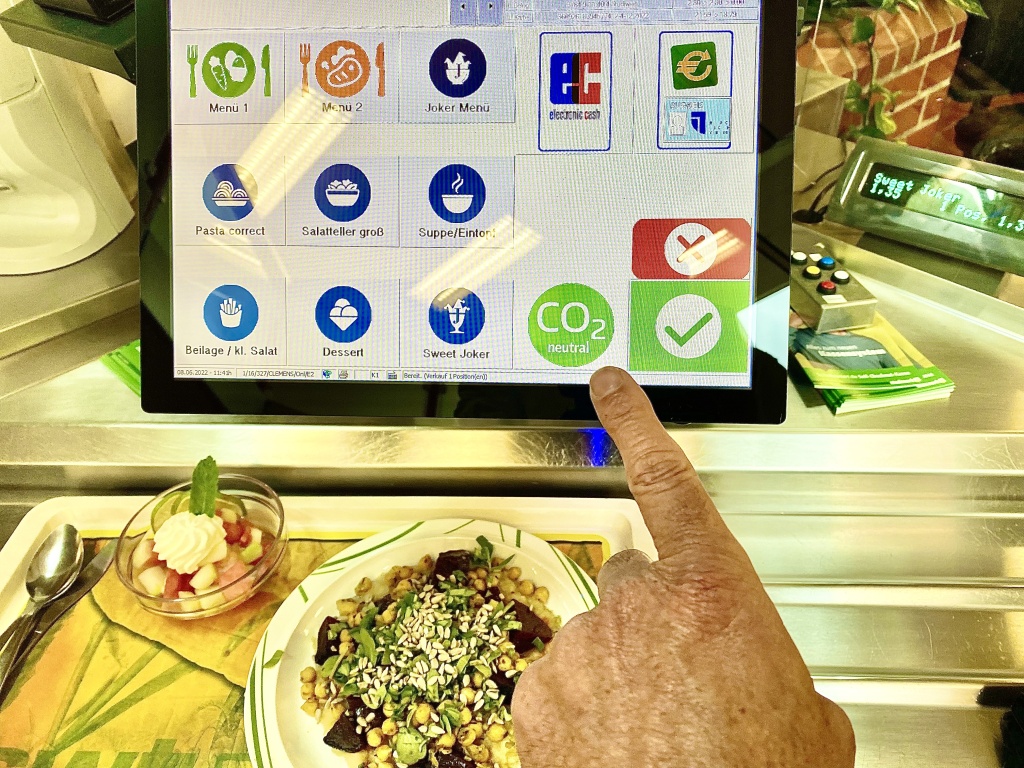 Seit dem Sommer 2022 weisen wir das Kohlendioxid-Äquivalent (kurz CO2eq) sämtlicher Mensagerichte auf unserer Speisekarte aus. Die Gäste werden so in die Lage versetzt auch diesen Faktor (der sehr oft zu Gunsten veganer Speisen wirkt) bei ihrer Speisenauswahl vorab zu berücksichtigen.