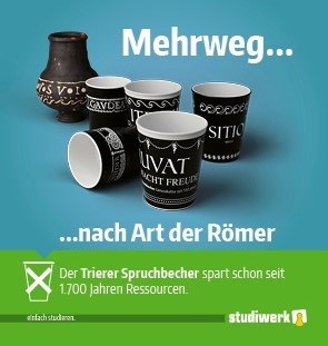 Wir bieten seit 2013 als Mehrweg-Kaffeebecher den „Trierer Spruchbecher“ an. Bei der Nutzung des Mehrwegbechers gegenüber Einwegbechern (die biologisch abbaubar sind) gibt es einen Rabatt von 20 Cent. Dazu haben wir an unseren Automaten sogenannte „Becher-Sperrtasten“ eingerichtet.